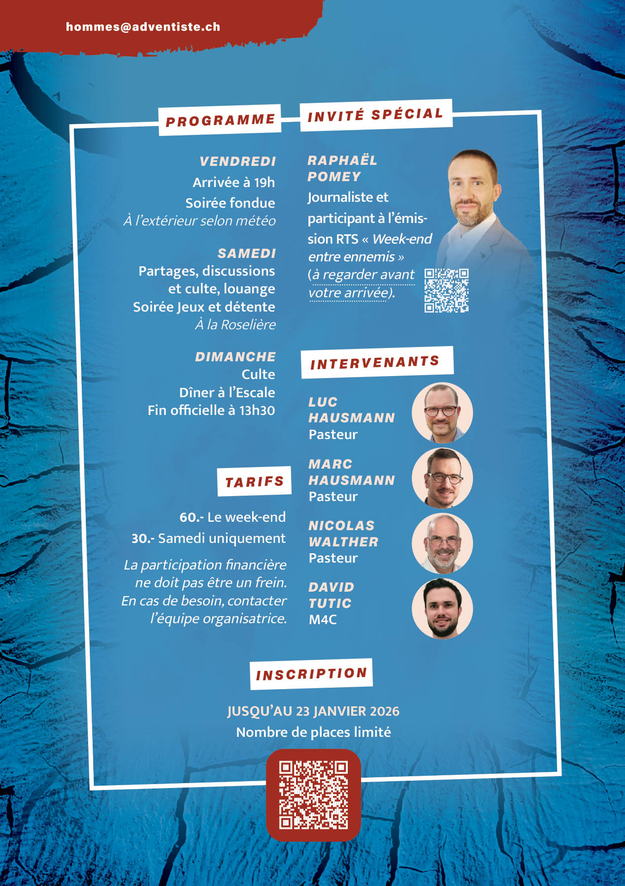 Pour plus d’informations : https://adventiste.ch/events/un-homme-pour-aujourdhui-entre-force-et-vulnerabilite/